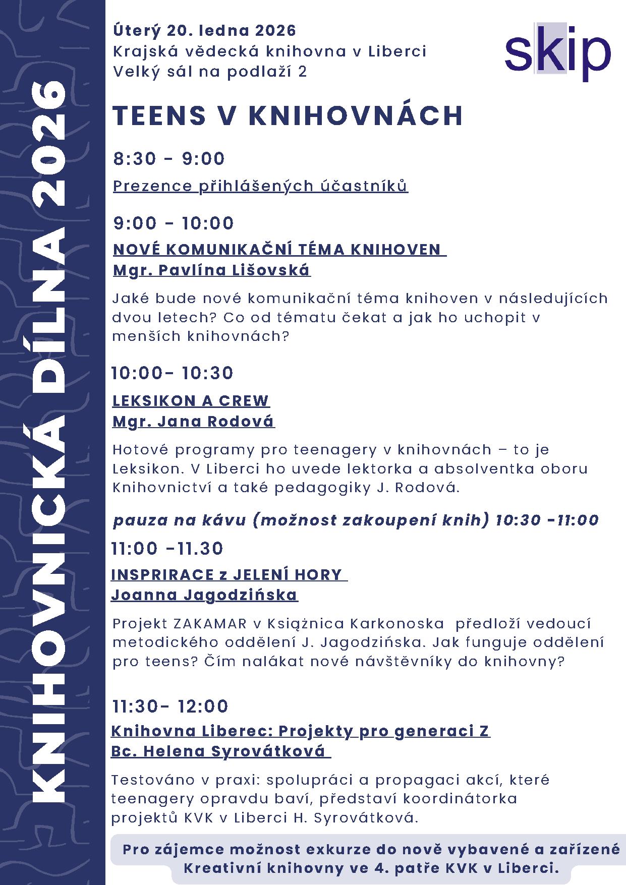 Testováno v praxi: spolupráci a propagaci akcí, které teenagery opravdu baví, představí koordinátorka projektů KVK v Liberci H. Syrovátková. - Pro zájemce možnost exkurze do nově vybavené a zařízené Kreativní knihovny ve 4. patře KVK v Liberci.