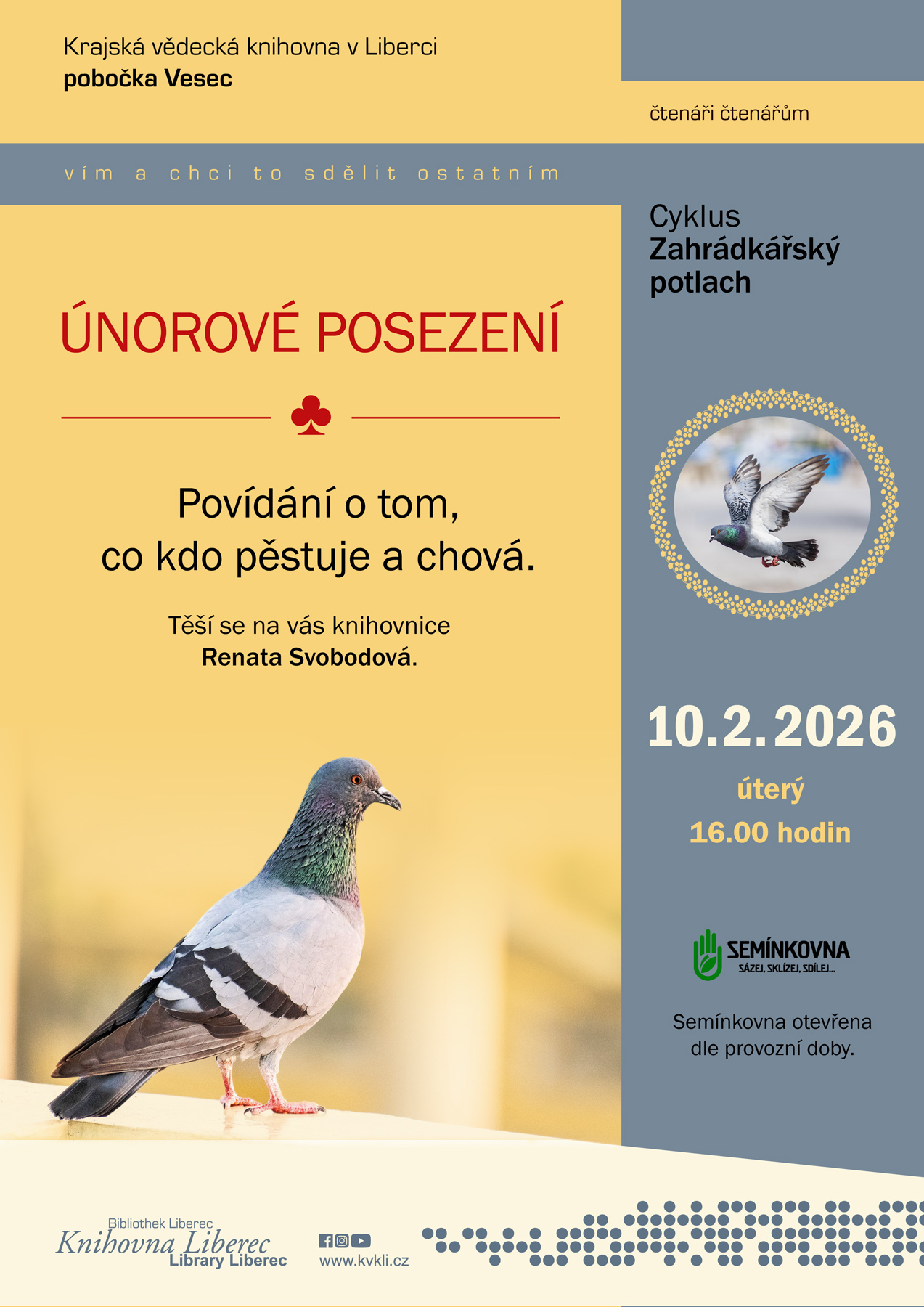 Výměna zkušeností, možnost výměny a darování semínek, novinky ze Semínkoven. Těší se na vás knihovnice Renata Svobodová.