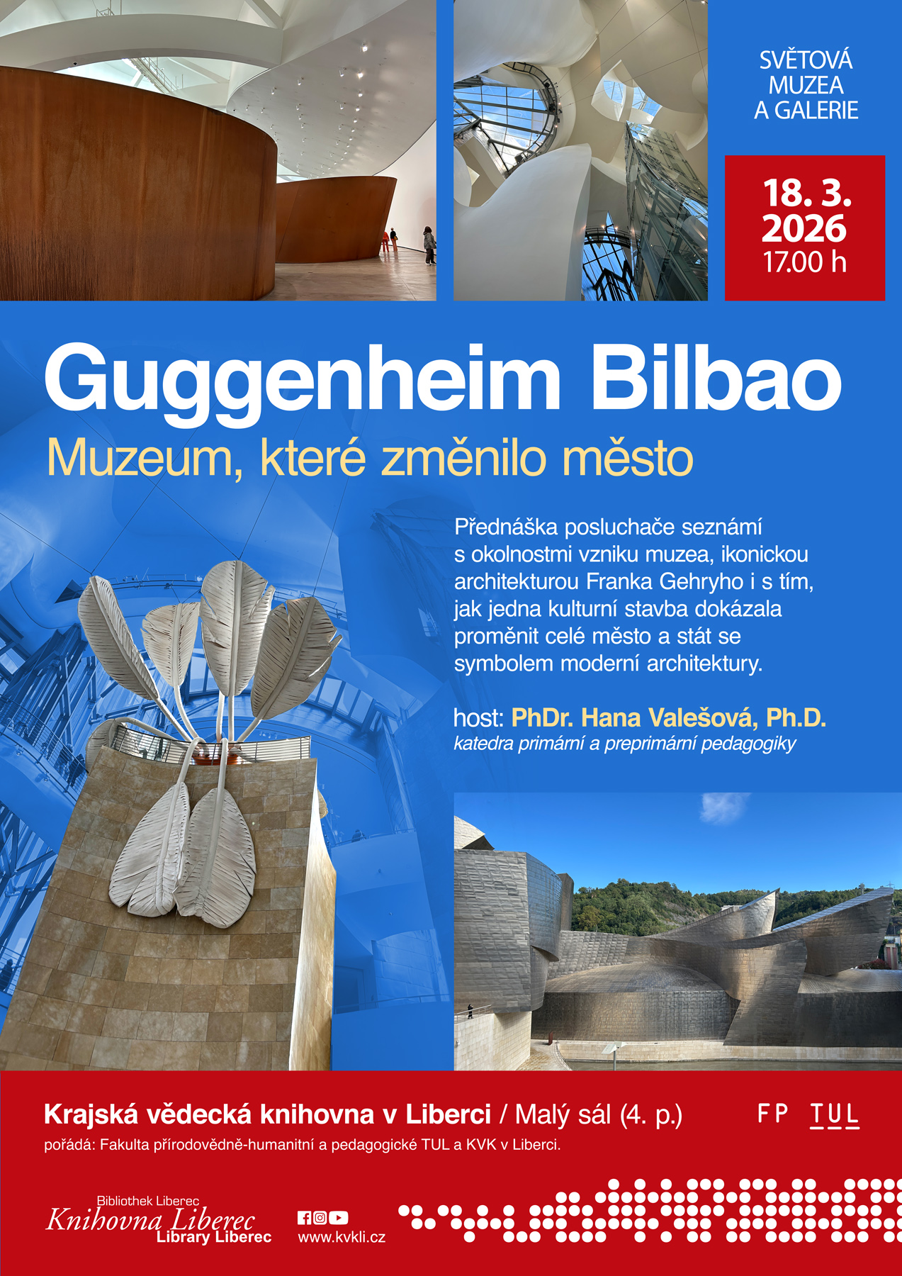 Přednáška představí Guggenheimovo muzeum v Bilbau jako jedinečný fenomén na pomezí architektury, umění a městského rozvoje. Seznámí s okolnostmi vzniku muzea, ikonickou architekturou Franka Gehryho i s tím, jak jedna kulturní stavba dokázala proměnit celé město a stát se symbolem moderní architektury.