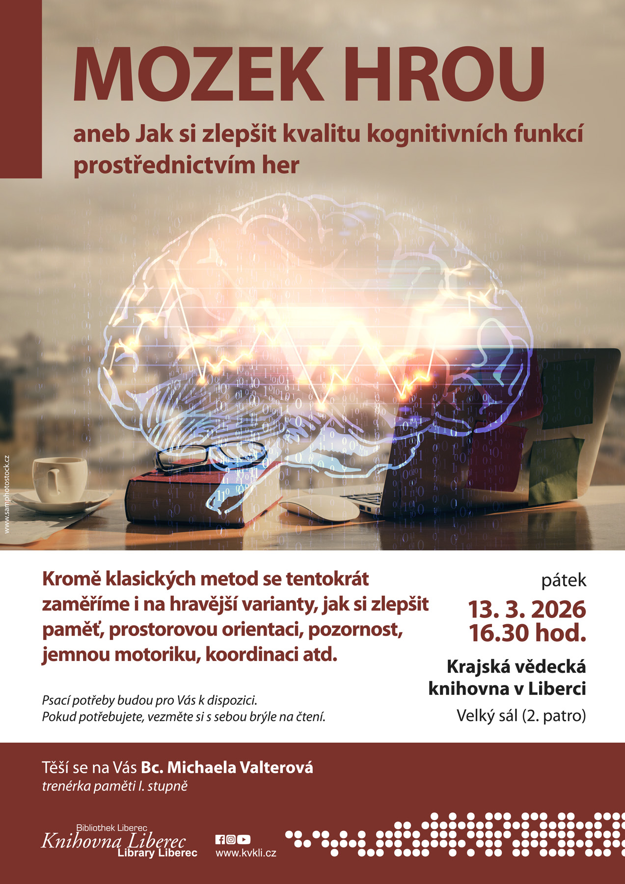 Mozek hrou aneb Jak si zlepšit kvalitu kognitivních funkcí prostřednictvím her. Kromě klasických metod se tentokrát zaměříme i na hravější varianty, jak si zlepšit paměť, prostorovou orientaci, pozornost, jemnou motoriku, koordinacii atd. Pokud potřebujete brýle, nezapomeňte si je vzít s sebou. Pořadem vás provede Michaela Valterová, trenérka paměti I. stupně.