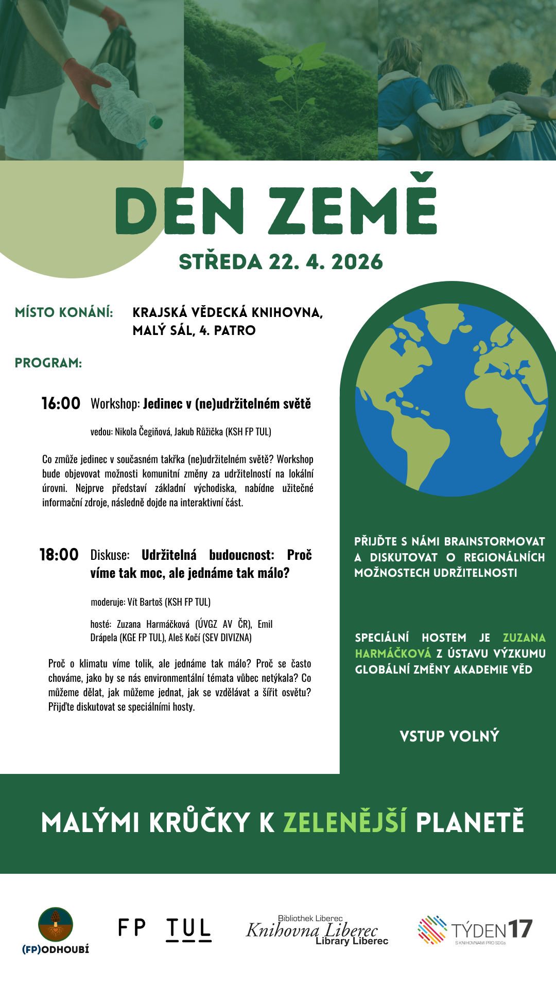 Proč o klimatu víme tolik, ale jednáme tak málo? Proč se často chováme, jako by se nás environmentální témata vůbec netýkala? Co můžeme dělat, jak můžeme jednat, jak se vzdělávat a šířit osvětu? Přijďte diskutovat s vědkyní z Akademie věd Zuzanou Harmáčkovou, vedoucím Střediska ekologické výchovy při Zoo Liberec Alešem Kočím a odborníkem na regionální rozvoj z FP TUL Emilem Drápelou o tom, jaká je naše situace a jak může vypadat udržitelná budoucnost.
