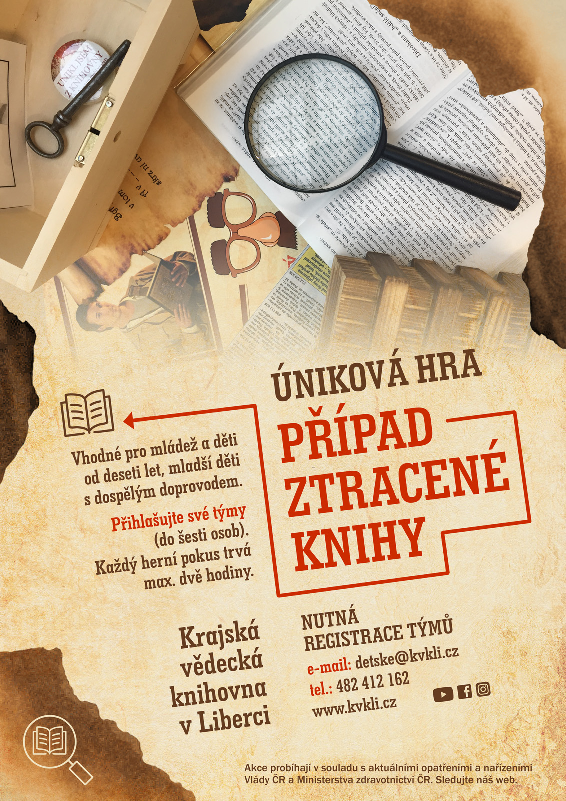 - 12:00 - 13:00 Pro zájemce bude po skončení setkání možnost vyzkoušet únikovou hru Případ ztracené knihy (6-8 osob - nutné přihlášení předem)