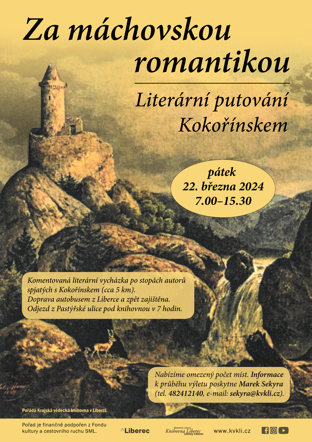 Komentovaná literární vycházka po stopách autorů spjatých s Kokořínskem (cca 5 km). Doprava autobusem z Liberce a zpět zajištěna. Odjezd z Pastýřské ul. pod knihovnou v 7.00 hodin