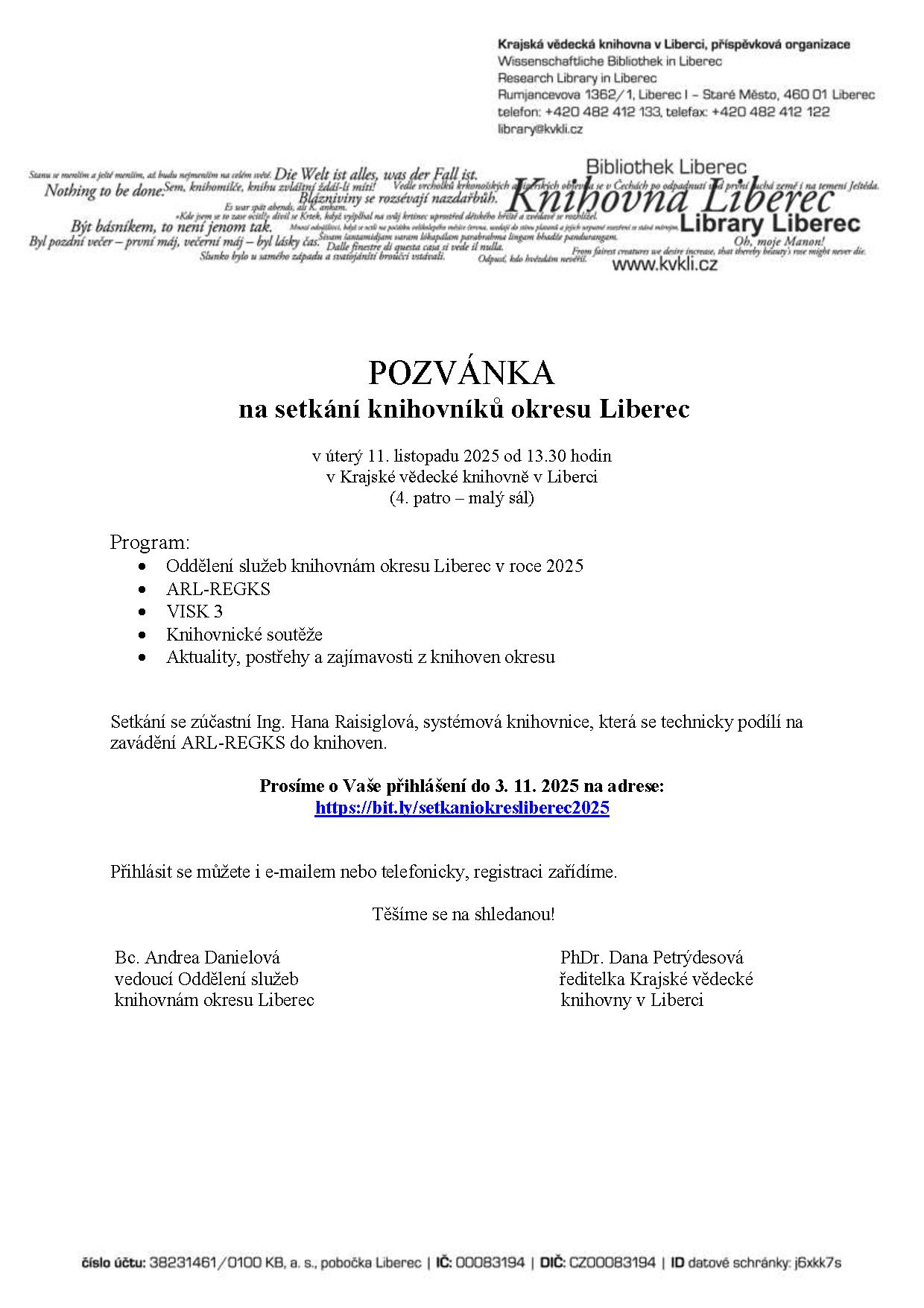 Akce je pořádána Krajskou vědeckou knihovnou v Liberci - Oddělení služeb knihovnám okresu Liberec.