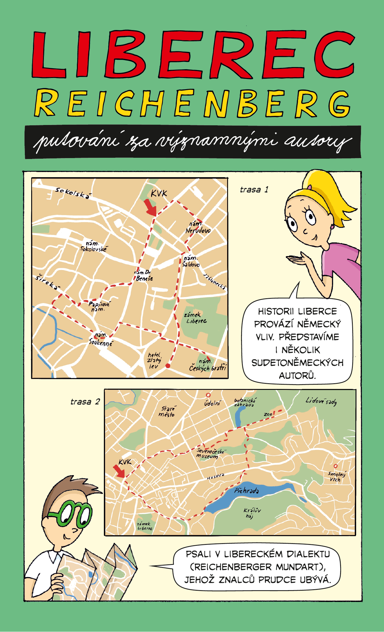 Třetí komiksová skládačka představuje dvě trasy po Liberci po místech spojených s působením významných autorů. První vede od knihovny přes Voroněžskou ulici, v níž žil německý spisovatel Benjamin Baier a jeho syn Karl, na Nerudovo náměstí. Další zastávkou je ulice 8. března, v níž v hotelu Zlatý lev nocoval Jan Neruda. Odtud vede trasa na náměstí českých bratří s domem, v němž rok žila Božena Němcová. Resslova ulice je spojena s významným autorem Wenzelem Zachariasem Resselem a sousední Široká ulice s Wilhelmem Gärtnerem.